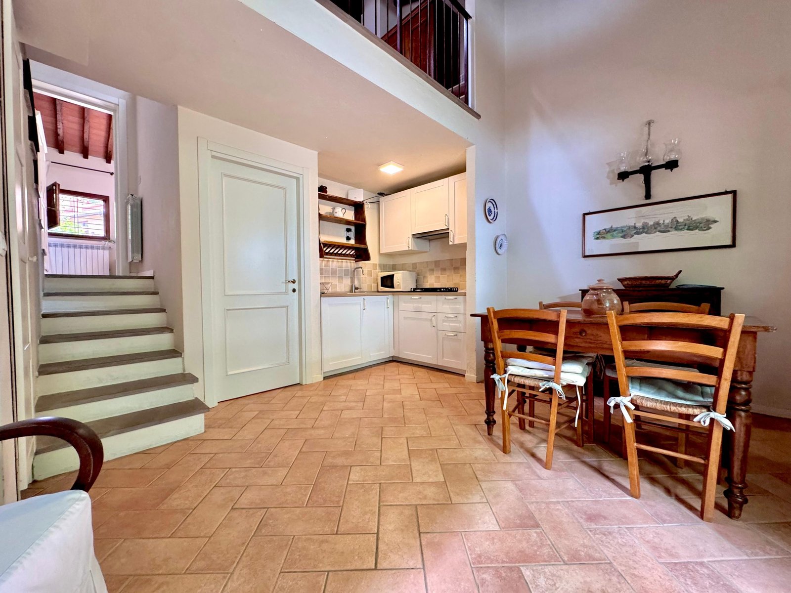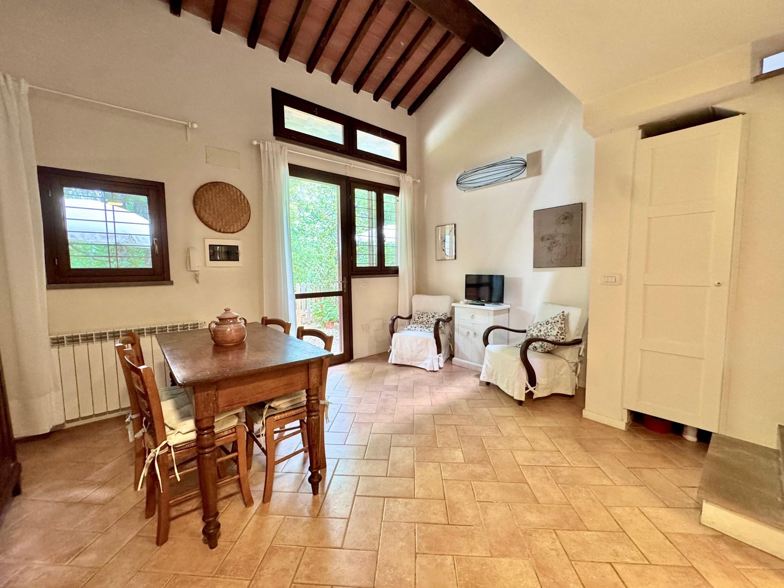 La zona giorno è composta da una cucina e un soggiorno luminosi, con accesso diretto al giardino privato, ideale per trascorrere momenti di relax all'aperto.